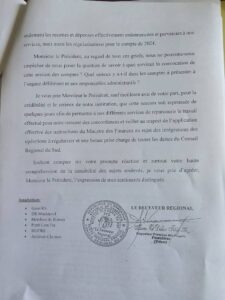 Selon des investigations faites auprès de sources internes au CRS, plus de six milliards de FCFA destinés au développement régional seraient retournés au Trésor public faute de consommation ou de réalisation d’actions concrètes avec l’argent mobilisé pour sortir la population de la pauvreté en droite ligne des orientations de la SND30. Ce fait marquant vient confirmer le manque de visibilité et les dysfonctionnements majeurs constatés dans la gestion du CRS par son exécutif durant les 5 dernières années. De même, le rapport 2023 de l’Agence de régulation des marchés publics (ARMP) indique que le Conseil régional du Sud a eu durant cet exercice un taux de 0 % de marchés réceptionnés par rapport aux marchés démarrés et non clôturés par des livraisons ou des réalisations effectives. Dans le même sens, un audit commandité par le ministère des Finances a fait mention dans ses rapports de ce que le CRS fonctionnerait sans budget effectif depuis sa mise en place. Donc il a navigué en vue de 2020 à 2025 sans que ses actions impactent véritablement la région alors qu’il est censé piloter le développement local.